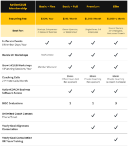 Become an ActionCLUB Member! $300 annual fee per participant + opt-in to program activities. Commit to working ON your business, not just IN your business.